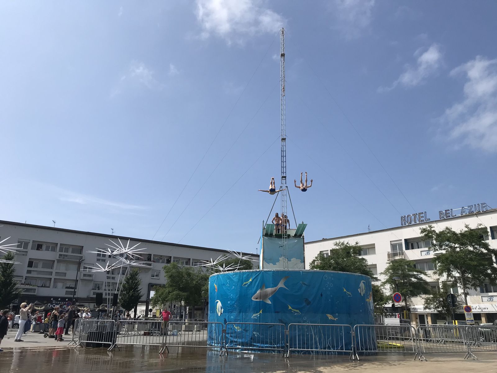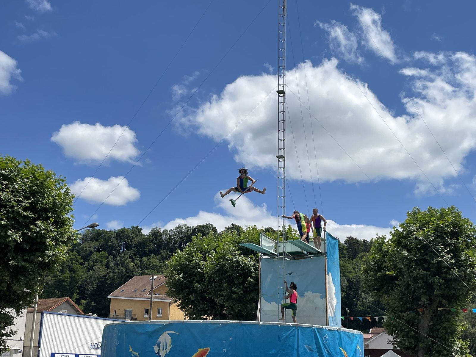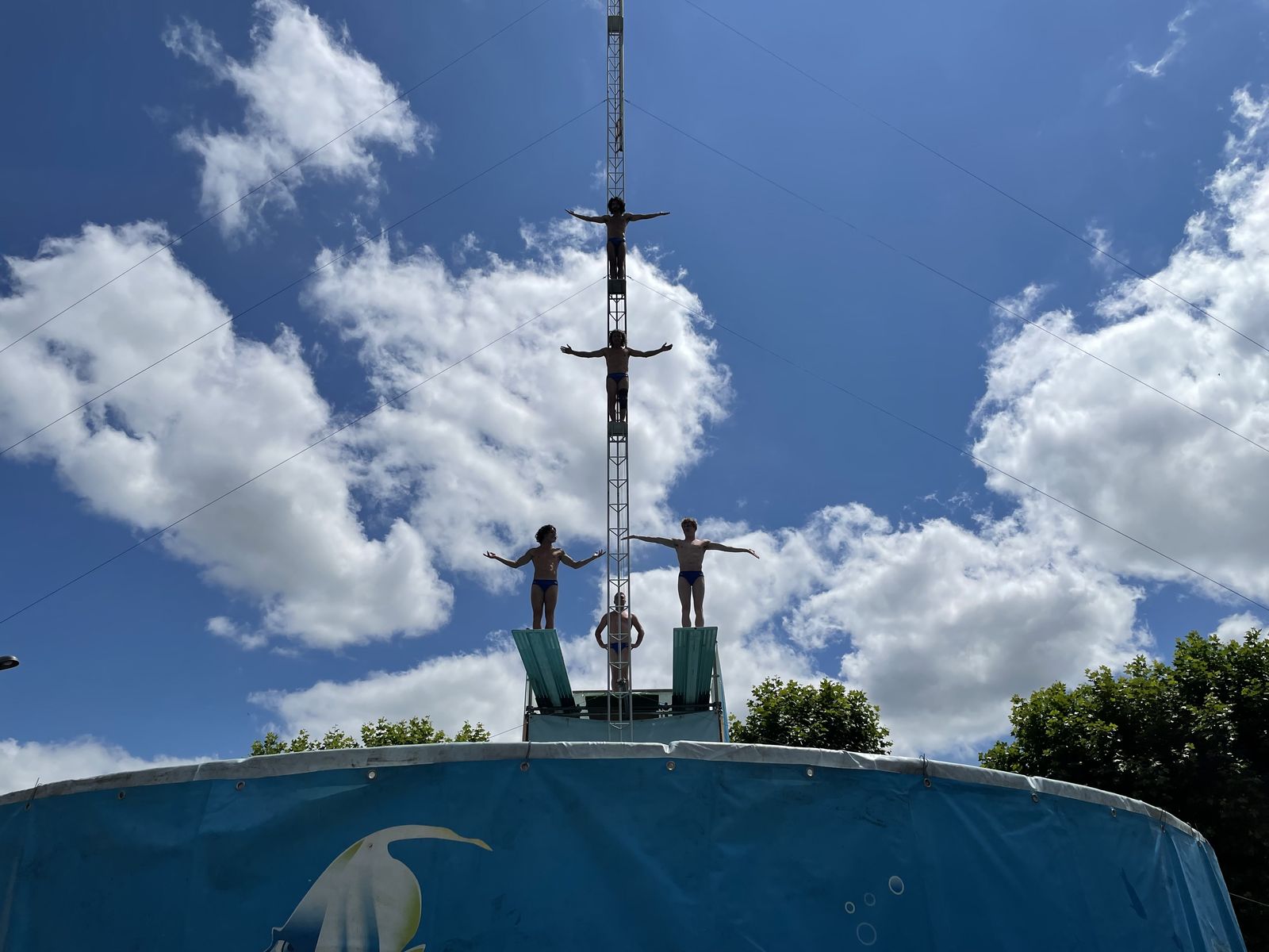 Un ballet aérien, spectaculaire et inventif, autour du vol et de la chute, de l’eau et du feu, où la scène est une piscine et les comédiens sont à 25 mètres de hauteur.