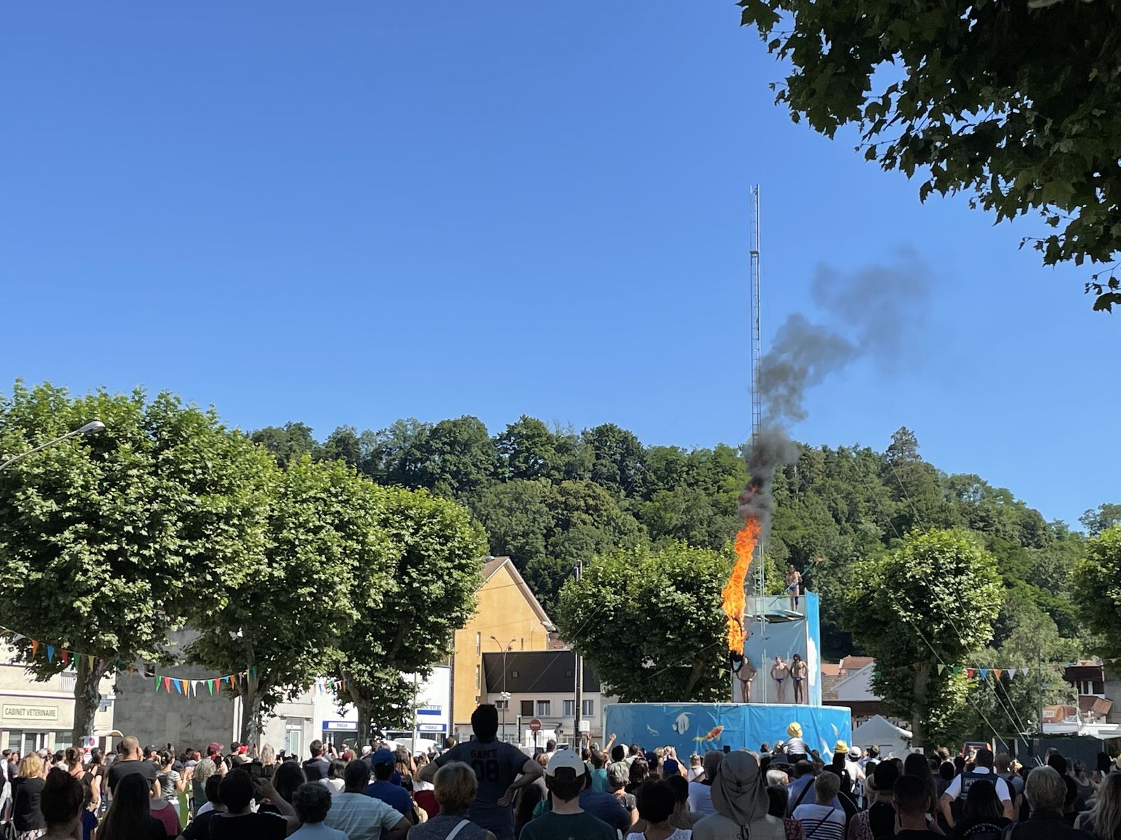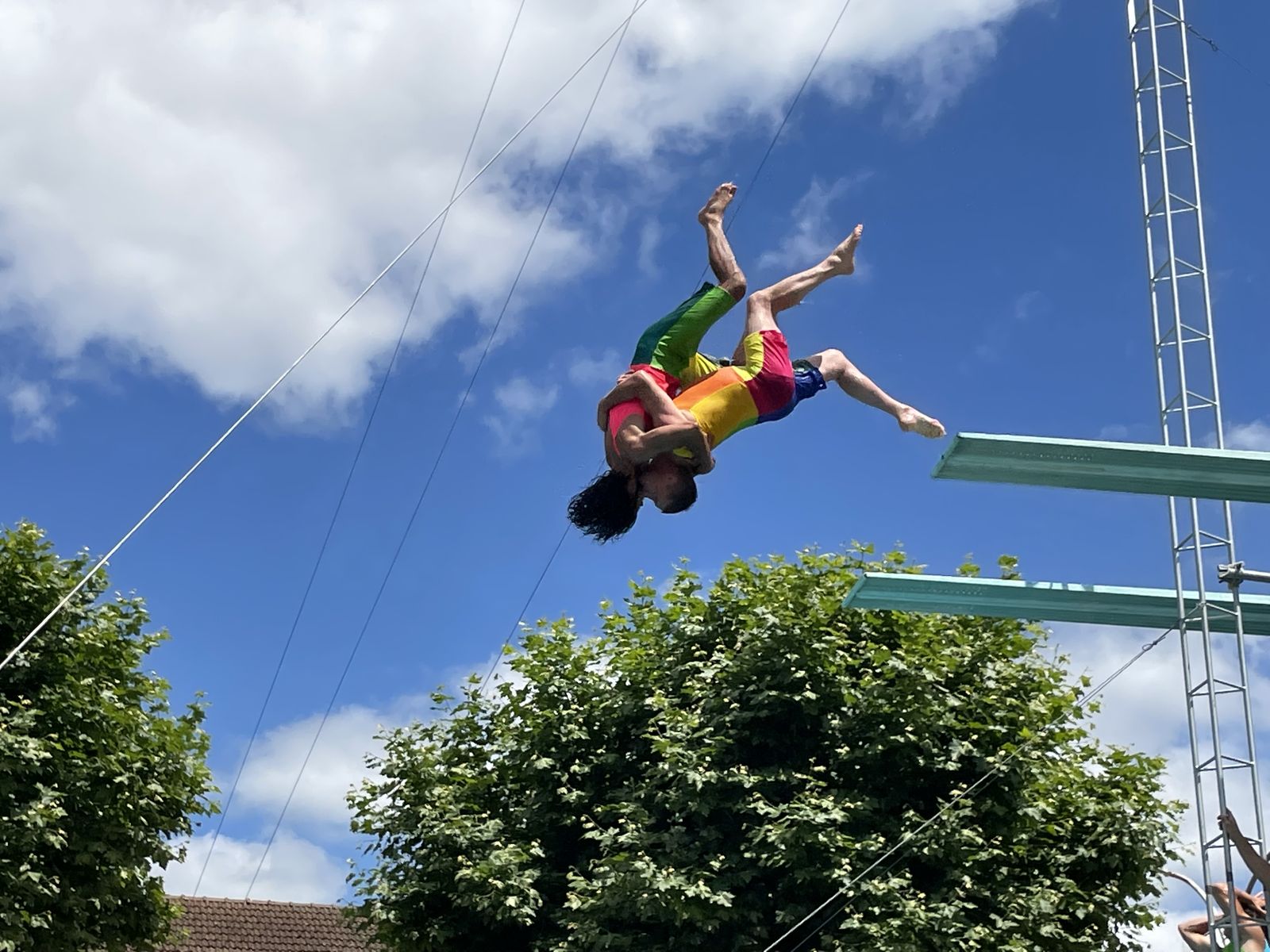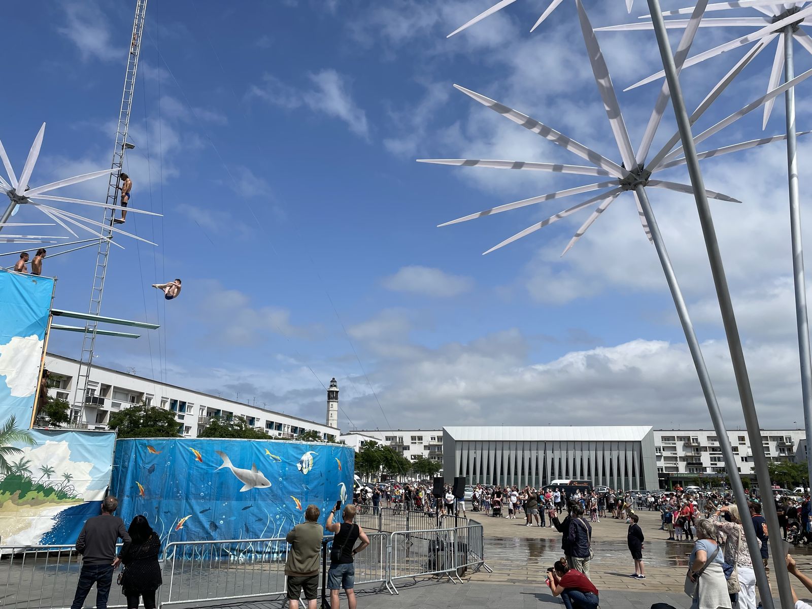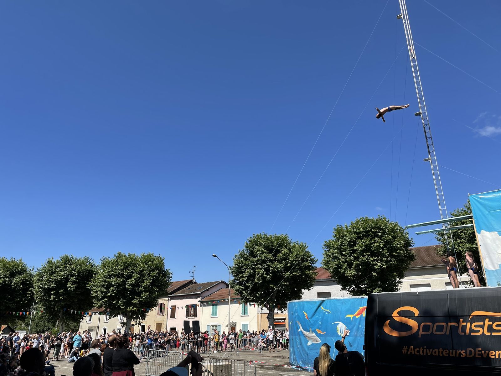 Un ballet aérien, spectaculaire et inventif, autour du vol et de la chute, de l’eau et du feu, où la scène est une piscine et les comédiens sont à 25 mètres de hauteur.