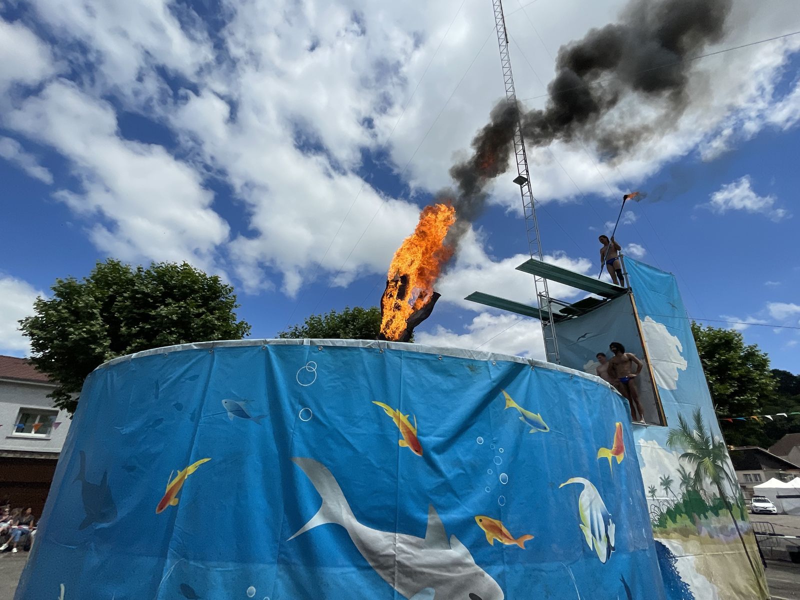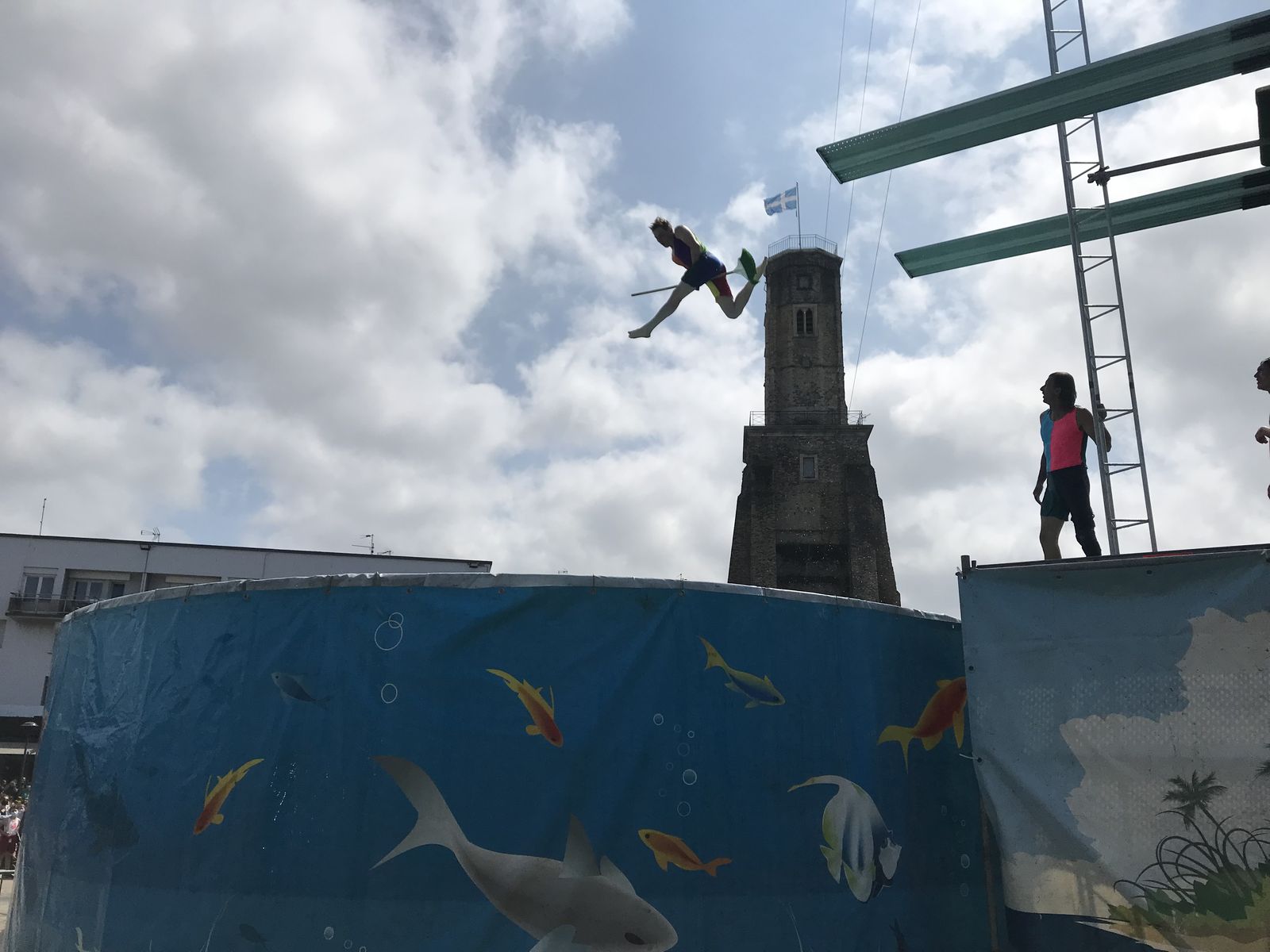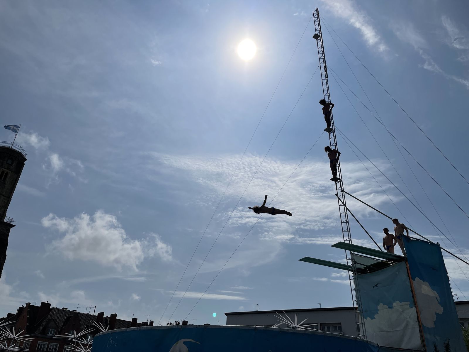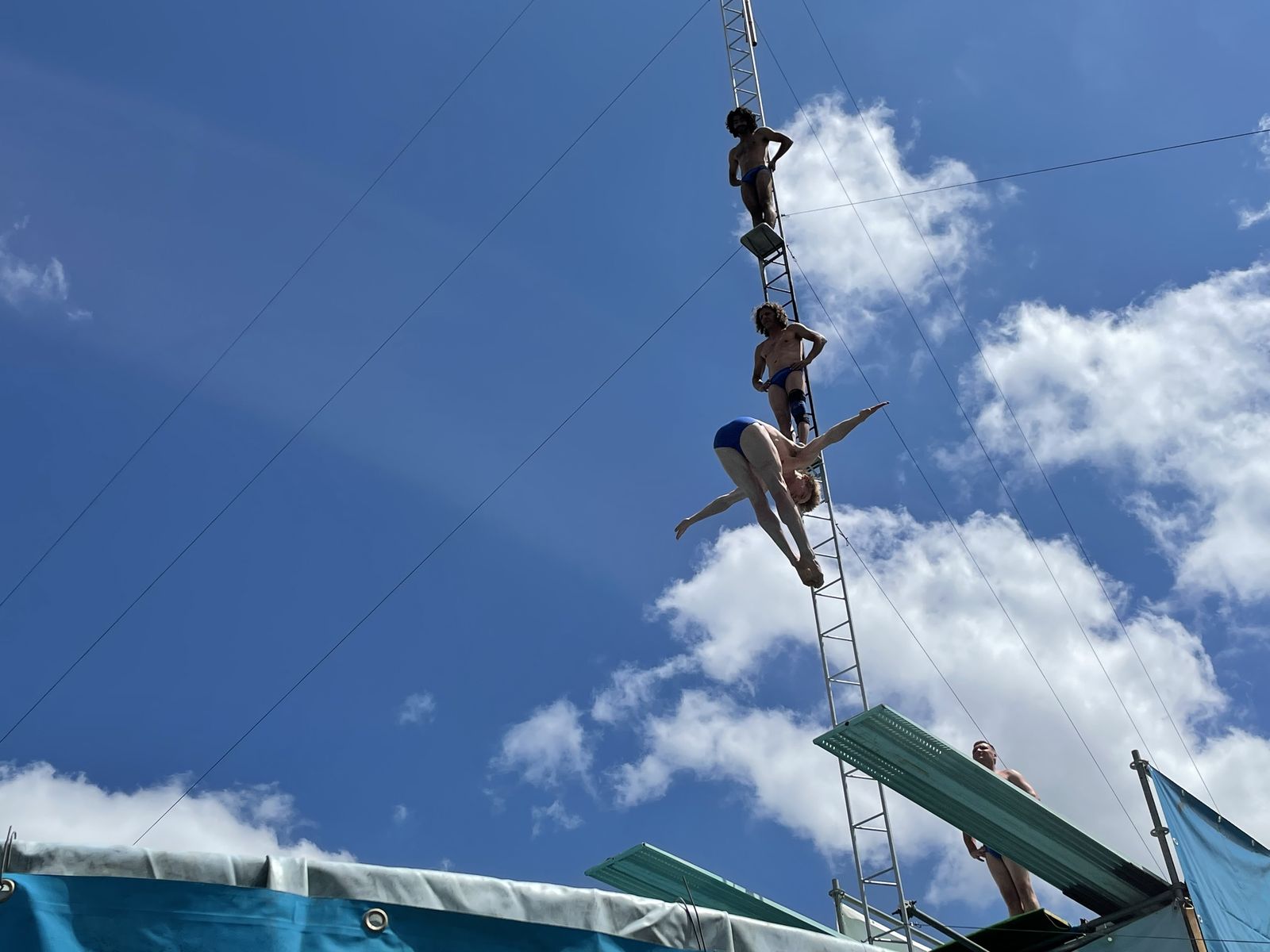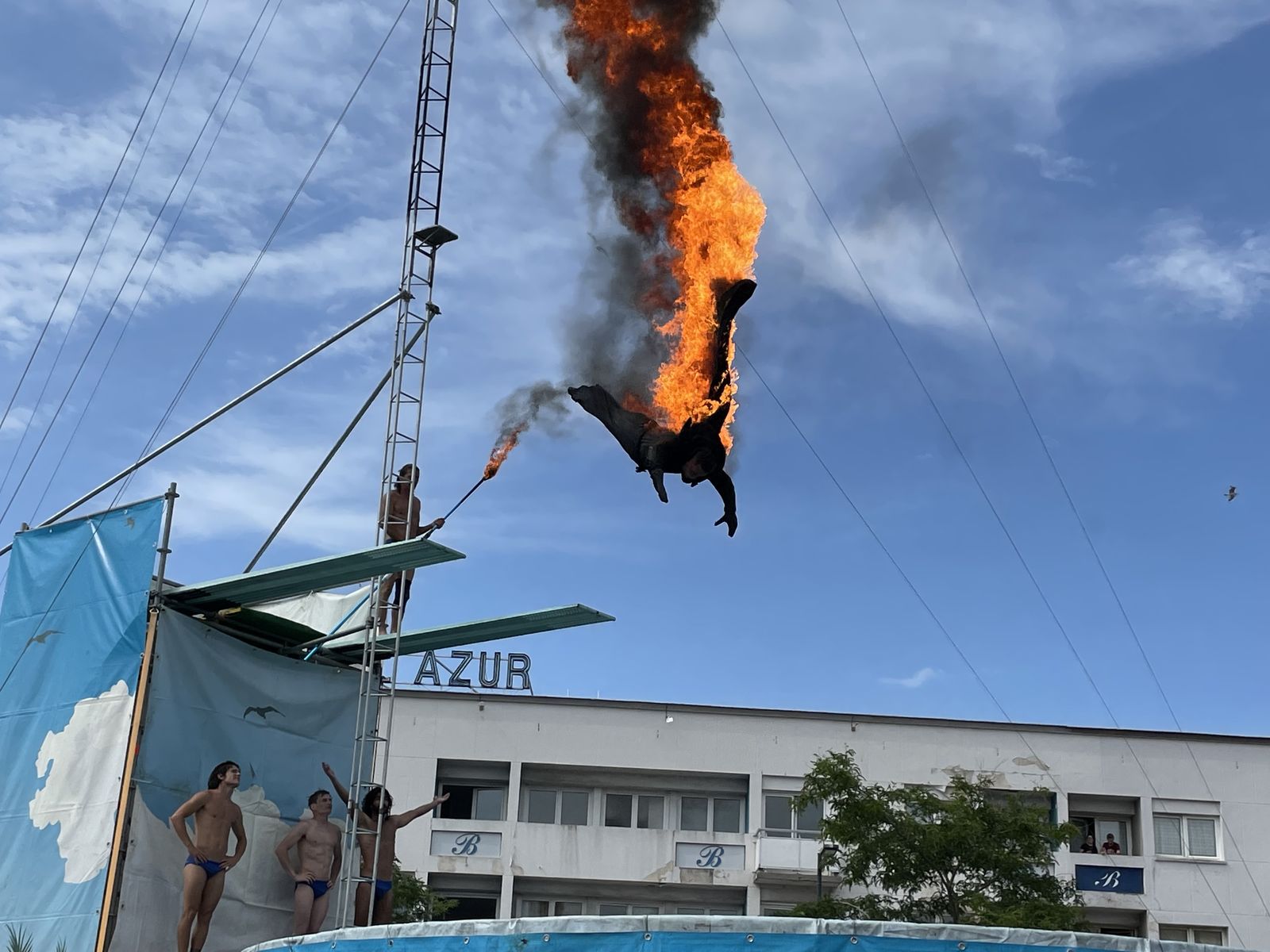 Spectacle époustouflant avec ces athlètes spécialisés dans le plongeon de haut vol, qui, en l’air, parfois totalement enflammés et en parfaite synchronisation, virevoltent, tourbillonnent et plongent de 25 mètres de haut dans une piscine de 2,70 mètres de profondeur!!!